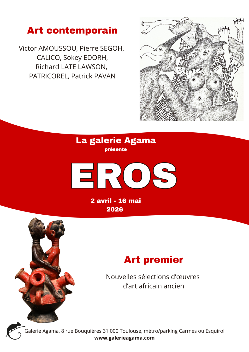 Ce printemps, la galerie Agama propose une exposition thématique dédiée à l’érotisme et la sexualité à travers le regard de plusieurs artistes contemporains ainsi qu’une sélection d’objets d’art africain ancien sur ce thème. Ce projet réunit les travaux de PATRICOREL (Bénin) et Patrick PAVAN (France), artistes représentés par la galerie, avec des artistes inédits : Victor AMOUSSOU (Bénin), Pierre SEGOH, CALICO, Sokey EDORH et Richard LATE LAWSON (Togo).